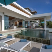 Wide-angle view of a luxury villa in Thailand comparing the space-saving benefits of sliding glass doors against traditional swing doors.